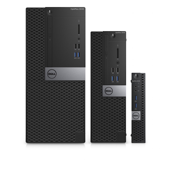 Three Dell OptiPlex 3040 desktop computers (Whitefish) facing forward in a row. From left to right, the Mini Tower, Small Form Factor and Micro models.