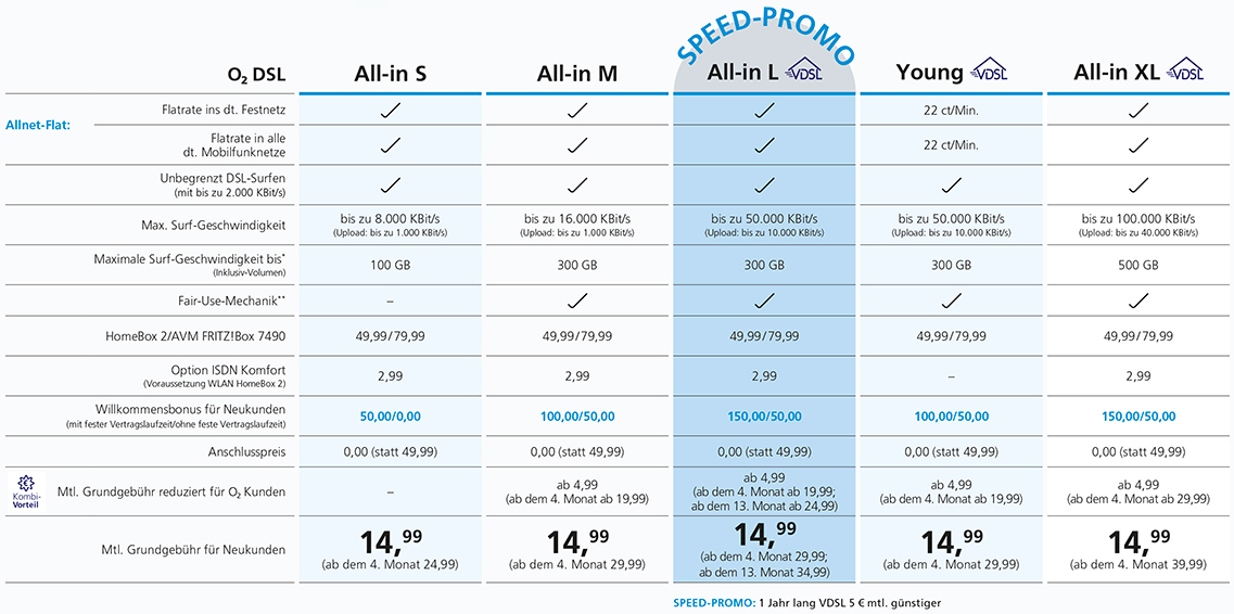 Auch Neukunden sowie O2 und BASE Mobilfunk-Kunden, die sich für den O2 DSL All-in M oder O2 DSL Young mit 24 Monaten Laufzeit entscheiden, erhalten einen Willkommensbonus in Höhe von 100 Euro. Dabei bietet der O2 DSL All-in M bis zu 16.000 Kbit/s, der Young sogar superschnelle 50.000 Kbit/s.