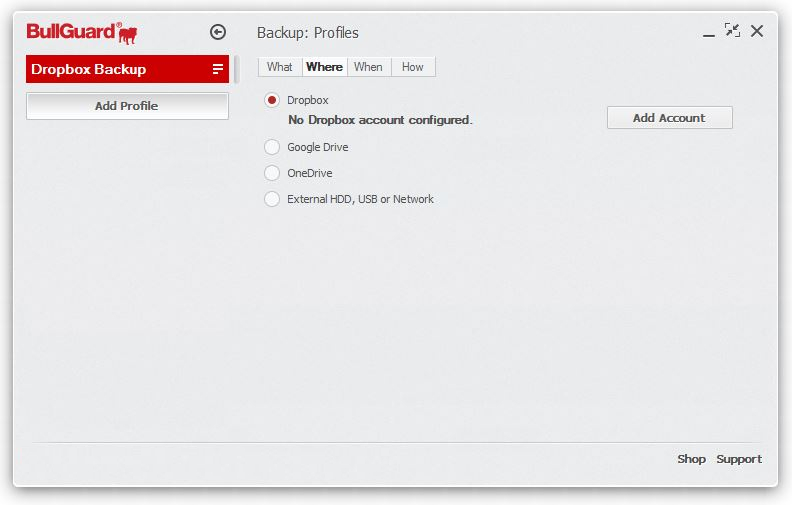 - Unkomplizierte, sichere Backups: Datensicherung mit BullGuard ist kinderleicht. Nutzer können ihre Dokumente und Ordner mit nur einem Klick direkt von ihrem BullGuard System aus in ihren bevorzugten Clouddienst hochladen. Dazu ist es nicht nötig, dass die Daten vom Computer in einen virtuellen Ordner bei Dropbox, Google Drive oder OneDrive hochgeladen werden.