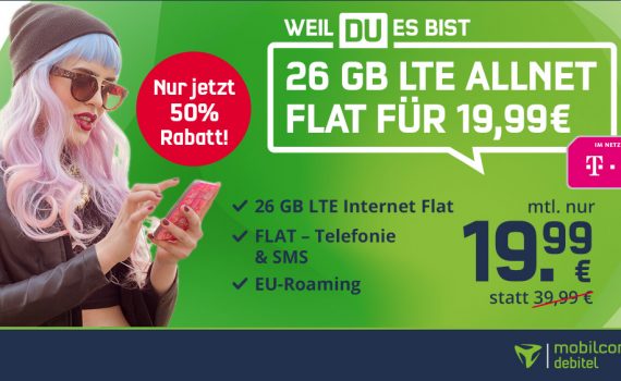 50 Prozent Rabatt! mobilcom-debitel Top-Tarif zum Sparpreis: 26 GB Telekom D1 Allnet Flat Handytarif zum Hammerpreis Aktuell gibt es bei mobilcom-debitel die 26 GB Allnet Flat im Telekom D1-Netz für nur 19,99 Euro im Monat. Zusätzlich dazu gibt es bei dem Angebot auch noch 2 Monate Readly gratis on Top! […]